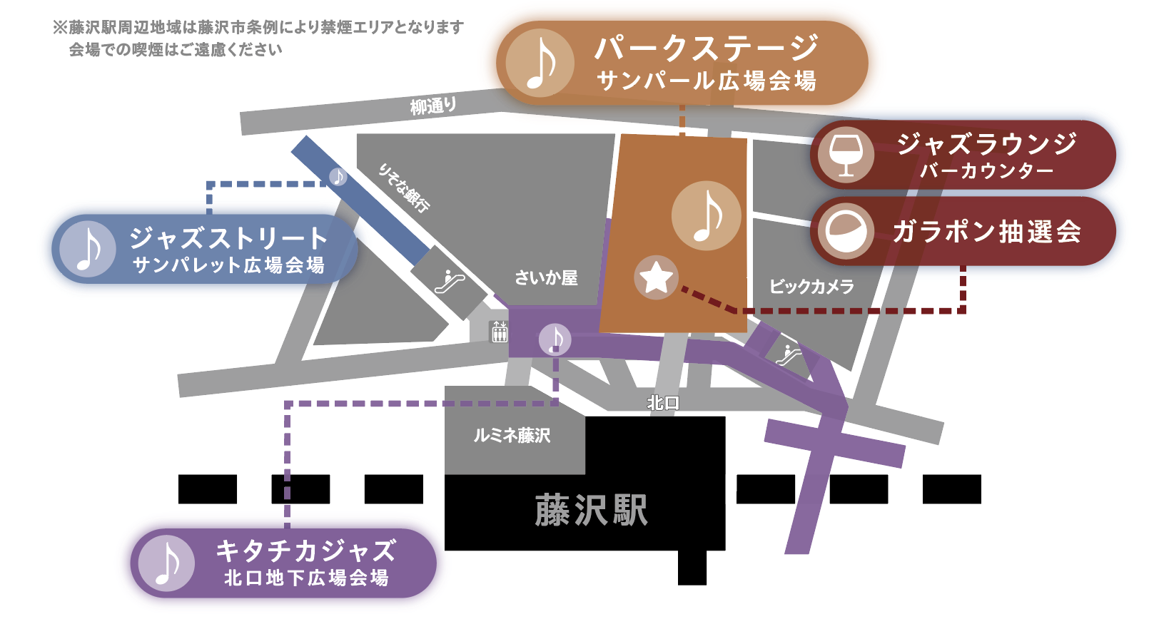 過去のイベントでは、“湘南ふじさわ” ゆかりのプロミュージシャン、アマチュアバンド、地域企業の有するベテランビッグバンド、有志の社会人ビッグバンドなど、地元 に籍を置く多数の個人・団体が共演し、それにより、相互の音楽観・人生観の共有・発展に寄与し、若手ミュージシャンの応援をしていくことを目指しました。そして、それを応援する街という土壌を醸成することで、この街に新たな一面を作り上げたいと考えています。